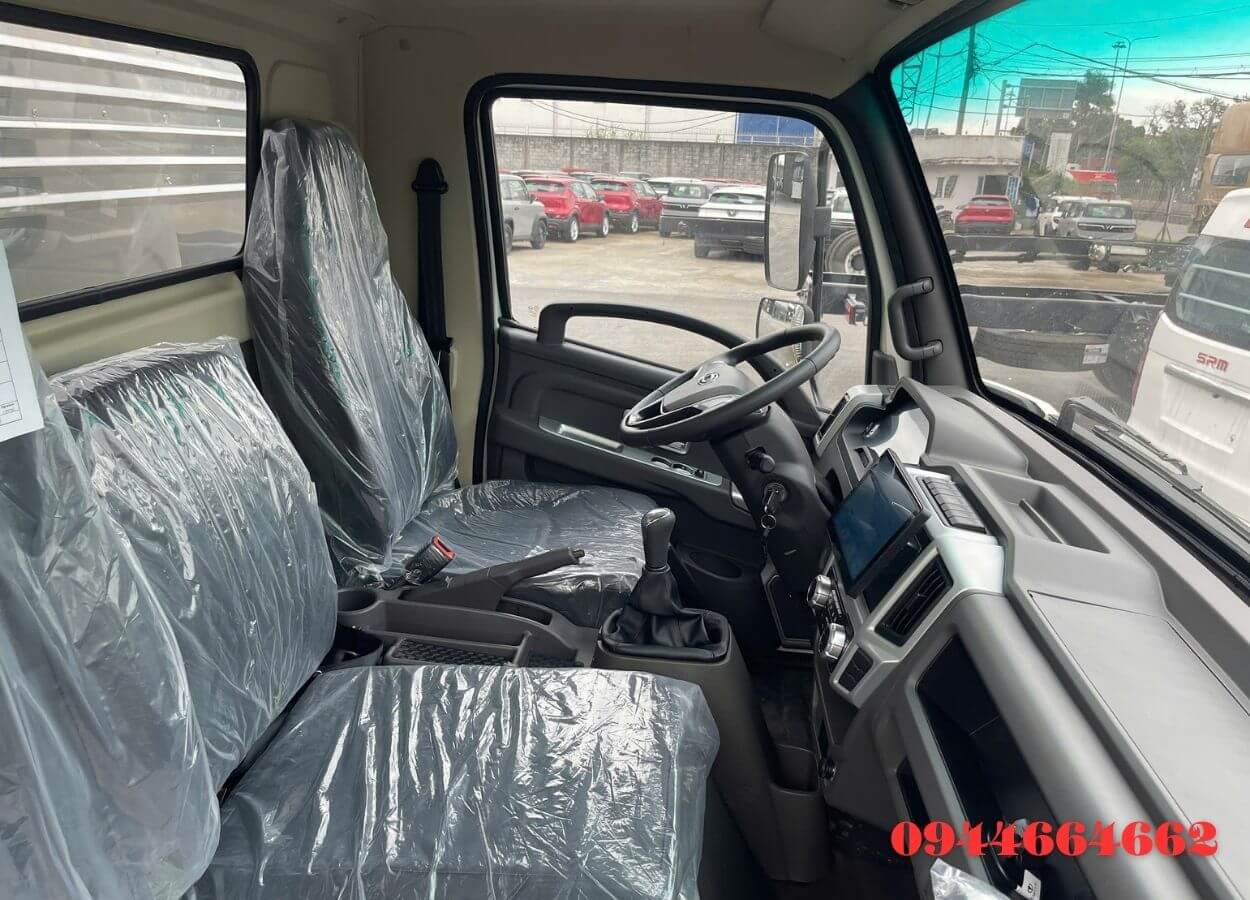 Cabin thiết kế vuông rộng rãi với 3 chỗ ngồi bọc da cao cấp, ghế ôm lưng, ghế tài xế ngả 45° giúp nghỉ ngơi thoải mái khi chờ hàng. Xe trang bị màn hình cảm ứng 7 inch giải trí đa phương tiện, tích hợp camera lùi hỗ trợ lùi xe an toàn trong không gian hẹp, cùng điều hòa 2 chiều công suất lớn, kính chỉnh điện một chạm, khóa cửa điều khiển từ xa và vô lăng 3 chấu gật gù, trợ lực lái nhẹ nhàng.